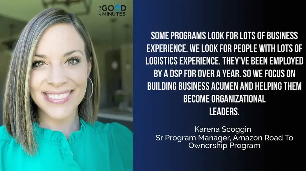 Karena Scoggin: What’s interesting about the program is, today if someone’s interested in becoming an Amazon DSP they can go through the standard process. And a lot of times these individuals, they have a lot of business experience, they’ve probably managed a PnL, they have experience leading and growing a team, but they may not have experience in logistics. Road to Ownership really flip-flops it. We’re bringing in individuals who have a lot of logistics experience, they’ve all been employed by their DSP for over a year. So what we focus on in training is building business acumen and helping them become a future leader in the organization.