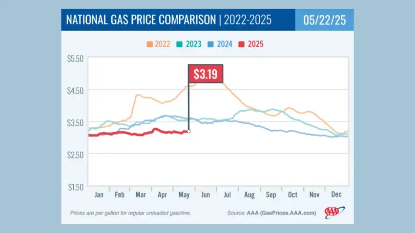 With millions of drivers preparing to hit the road for Memorial Day weekend, gas prices have remained stable nationwide, providing welcome news for travelers. According to AAA, the national average for a gallon of regular gasoline holds at $3.19, unchanged from the previous week and significantly lower than one year ago, when prices stood at $3.61.